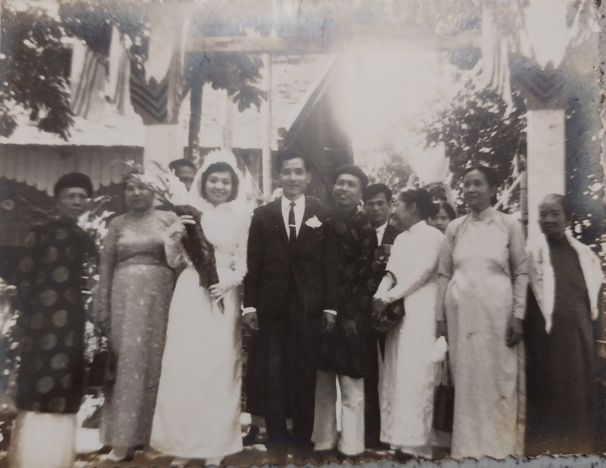 Tấm ảnh chụp ở cổng nhà đủ họ hàng hai bên, ông bà tôi, ba má tôi, má chồng. Ai cũng vui...
