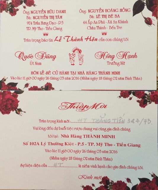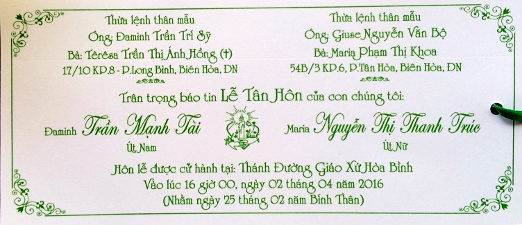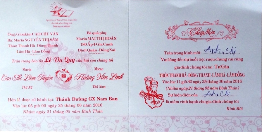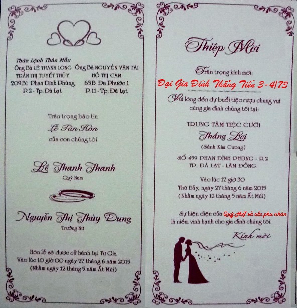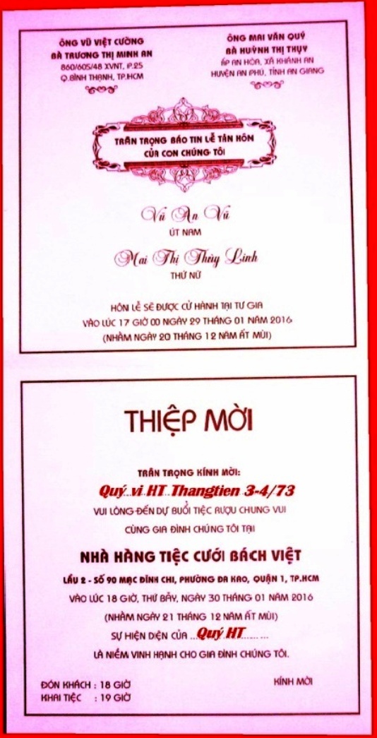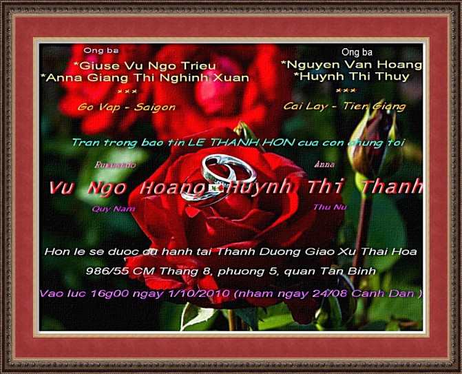 Thay mặt khóa 3&4/73 SVSQ/TBTX - Trang Thẳng Tiến chia vui cùng gia đình TT Cao Chu Vân - chúc hai cháu Văn Linh - Lâm Tuyền, sắt cầm hão hiệp, trăm năm hạnh phúc. |