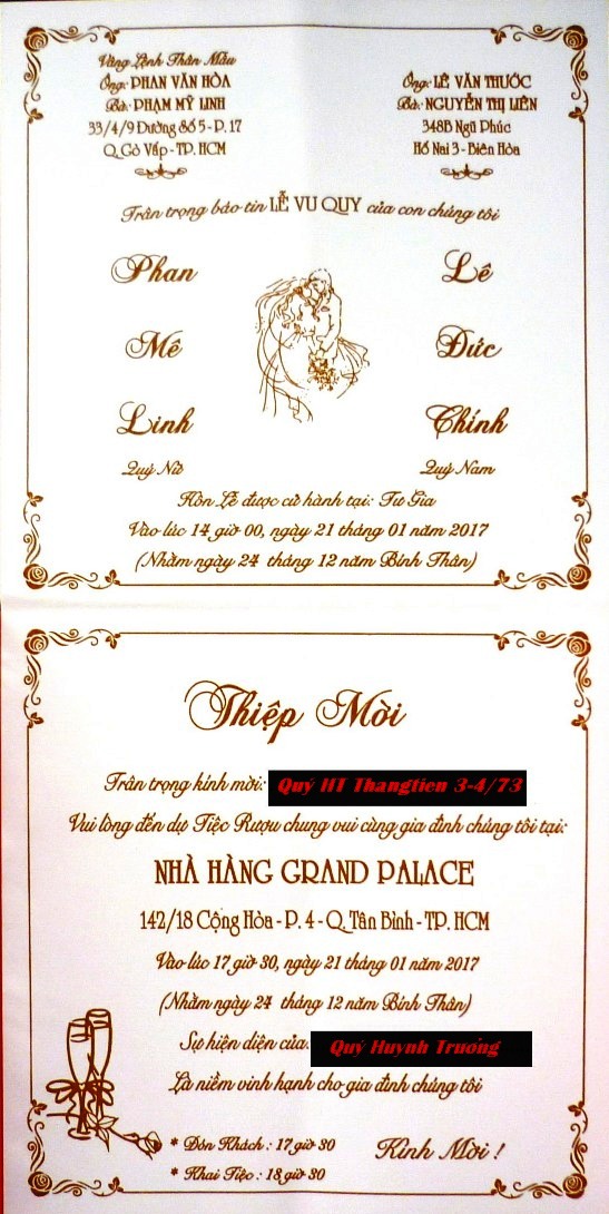 Thay mặt khóa 3&4/73 SVSQ/TBTX - Trang Thẳng Tiến chia vui cùng gia đình TT Phạm Văn Hòa - chúc hai cháu Mê Linh - Đức Chính, sắt cầm hão hiệp, trăm năm hạnh phúc.- |