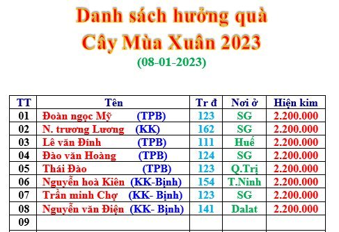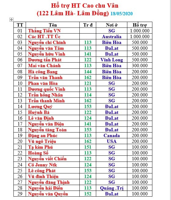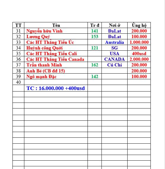 Của ít lòng nhiều. Mong các HT xa gần tổ chút lòng Huynh Đệ Chi Binh giúp các đồng môn, đồng khóa, đồng đội của chúng ta có được những ngày Xuân ấm áp trong hoàn cảnh khó khăn hiện tai. Thay mặt BĐD.TTVN TẠI SG một lần nữa xin tri ân toàn thể các HT.