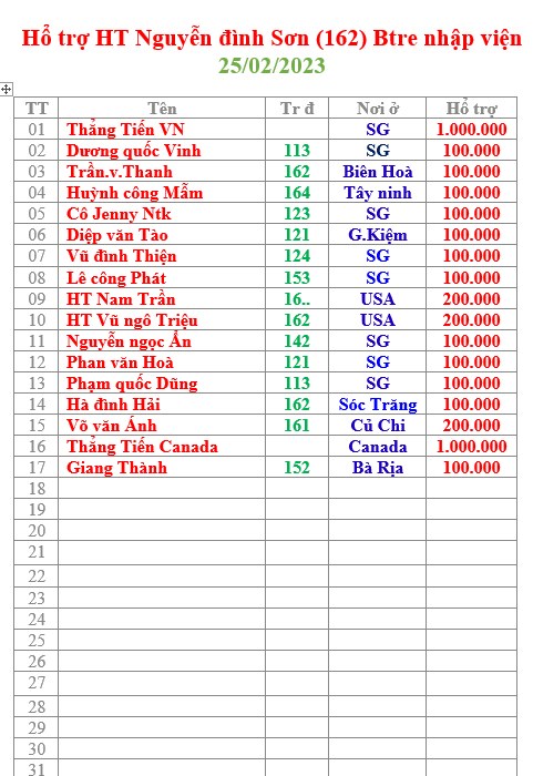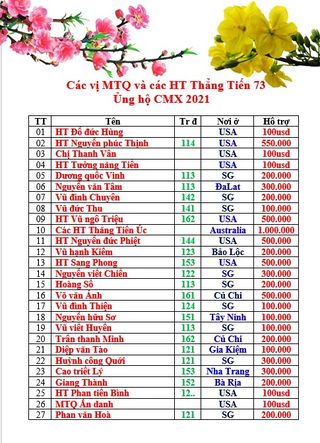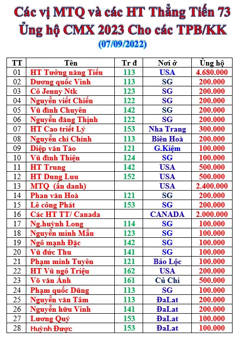Đề nghị tất cả các HT thuộc Thẳng Tiến 73 tại VN cũng như trên tất cả các nước có sự hiện diện của đồng môn, đồng khóa với chúng tôi, hưởng ứng lời kêu gọi đóng góp cho các anh em TPB và các anh em có hoàn cảnh khó khăn trong cuộc sống hiện nay, sẽ tổ chức trao lại cho các anh em nói trên trong dịp CÂY MÙA XUÂN 2020 (dự kiến giữa tháng 01/2020) gần giáp Tết Âm Lịch CANH TÝ 2020.